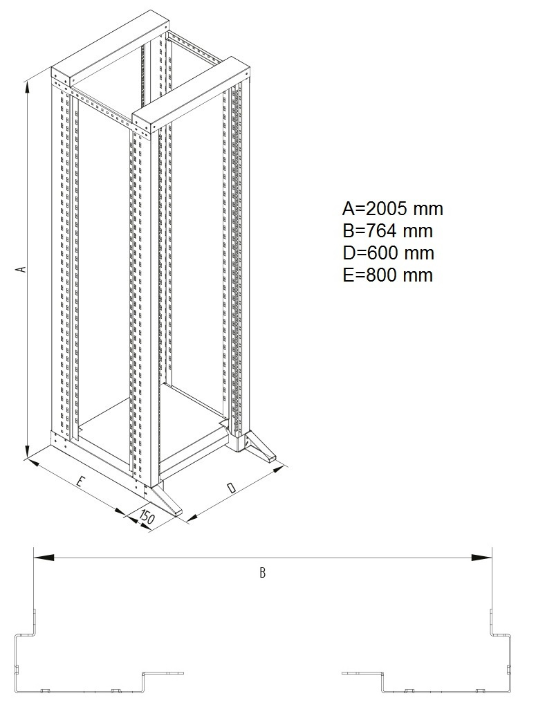 *19“ profilový rám je vhodný pro umístění přímo na podlahu pomocí nivelačních nožiček anebo koleček (kolečka nejsou součástí příbalu).