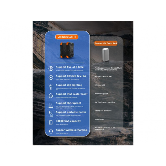 S naší outdoorovou powerbankou Viking SKADI III už se nemusíte ničeho obávat. Tato vysoce odolná a výkonná powerbanka s kapacitou 30000 mAh/111Wh byla navržena tak, aby vydržela extrémní podmínky a poskytla vám energii, když ji nejvíc potřebujete.