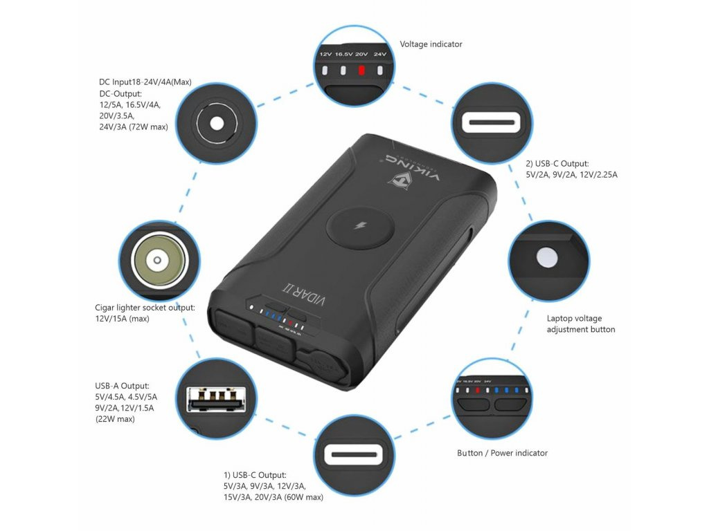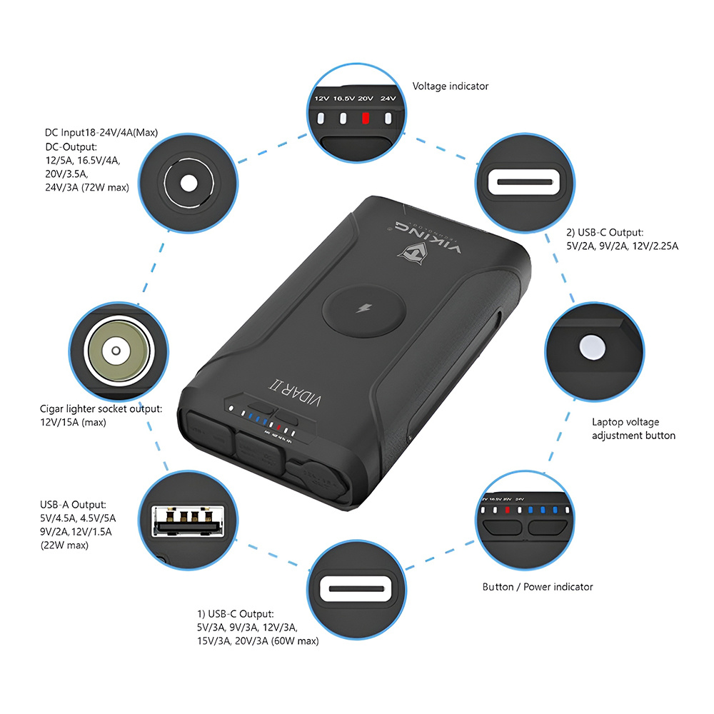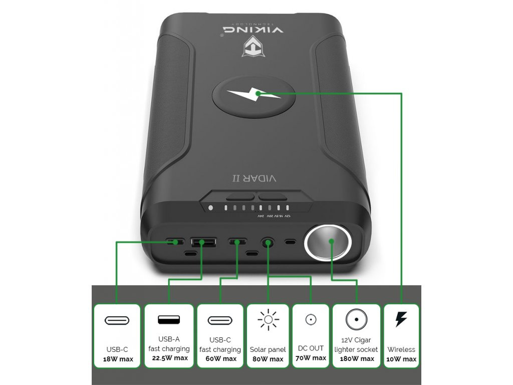 Outdoorová powerbanka Viking VIDAR II • Kapacita: 72000mAh/266.4Wh • Maximální výkon: 180W • Zabudované LED světlo • Široká škála vstupů a výstupů (USB-A, USB-C, Cigaretová zásuvka, DC-jack, WIRELESS Qi) • Možnost solárního napájení • Funkce Pass-Through • Odolnost IP65