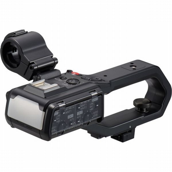 VW-HU1 se připevňuje k horní části kamery pomocí proprietárního konektoru a je zajištěn palcovým šroubem. Dva 3kolíkové zvukové vstupy XLR mají ovládání hlasitosti a volitelné funkce fantomového napájení mic/line a + 48 V, takže k záznamu můžete přidat dva zvukové kanály. Držák mikrofonu nahoře se hodí pro standardní přídavný "shotgun" mikrofon.