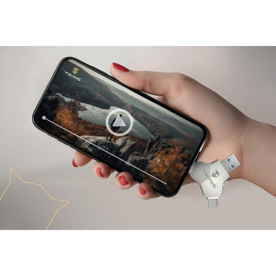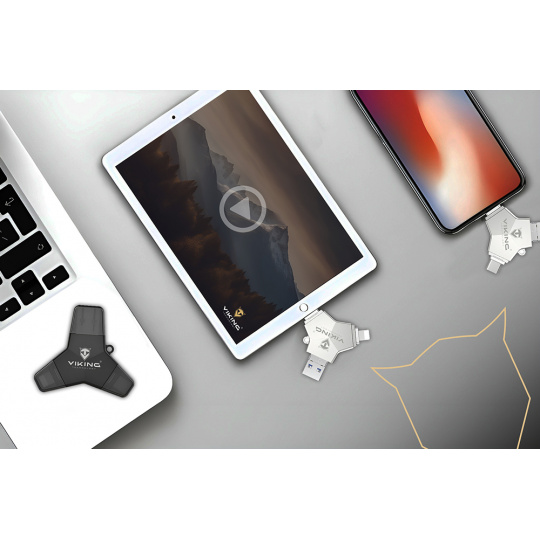 Viking USB flash disk 3.0 • 4 konektory: USB-A, USB-C, Micro USB, Lightning • Tři varianty: 32 GB, 64 GB nebo 128 GB • rychlost až 100?MB/s • podpora FAT32 a exFAT • vhodný pro iOS, Android, PC i Mac • Kompaktní a lehké provedení • hmotnost 17,2?g