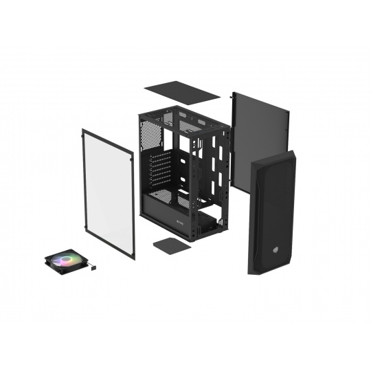 Futuristický geometrický tvar se bude líbit jak hardcore hráčům, tak i těm, kteří dávají přednost decentnějšímu designu. Levý boční panel z tvrzeného skla je příležitostí k odhalení vnitřku skříně a výkonných komponent ukrytých uvnitř - také s RGB, zejména proto, že instalovaný ventilátor je předsvícený.