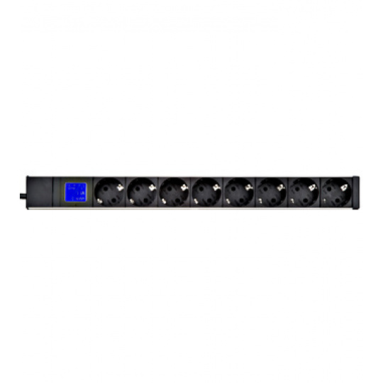 Napájecí panel PDU řady IT METER LINE představuje inteligentní řešení napájení v datových rozvaděčích. Konfigurace zásuvek: 8x SCHUKO 230 V. Vyznačuje se měřící přesností +/- 1% všech základních elektrických veličin jako jsou napětí, proud, výkon, frekvence, fázový posun nebo energie. Hodnoty se poté zobrazují na podsvíceném LCD displeji.