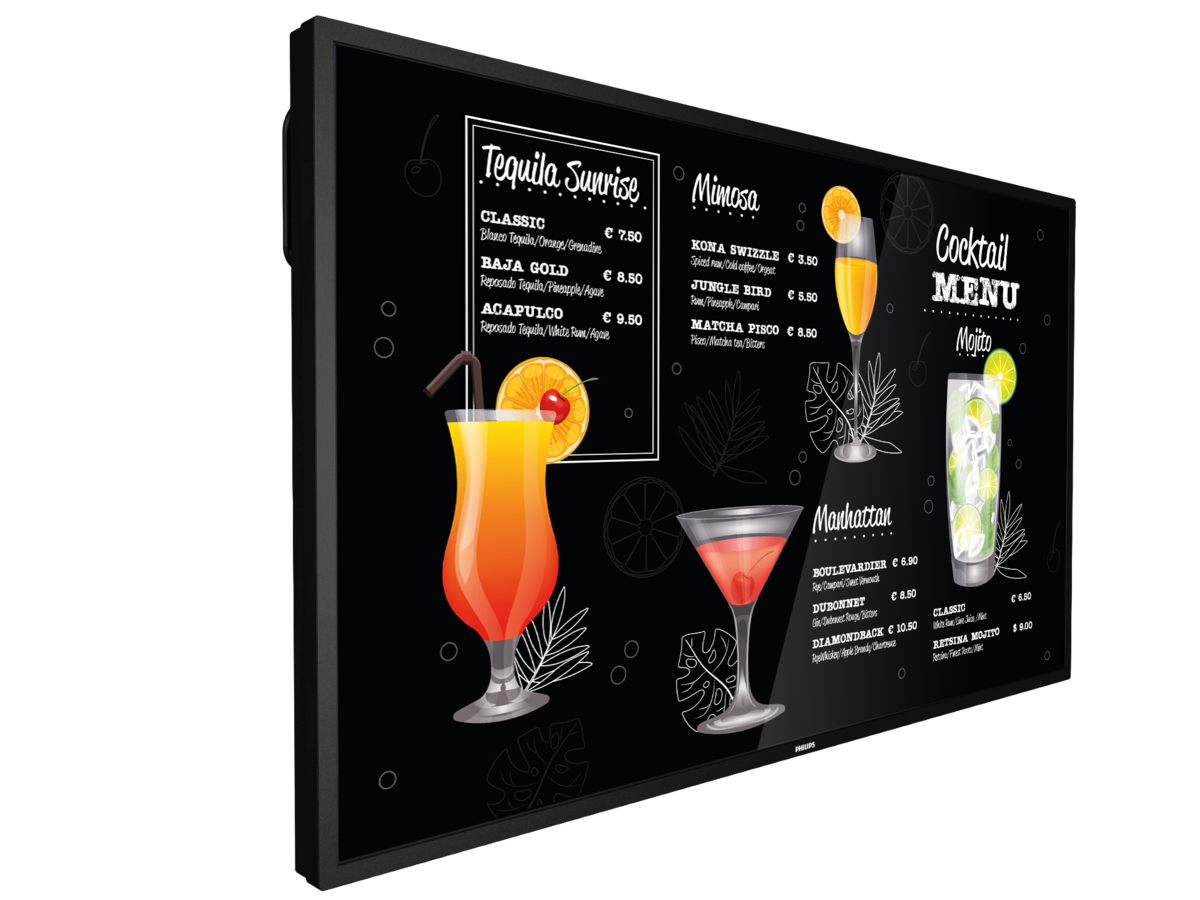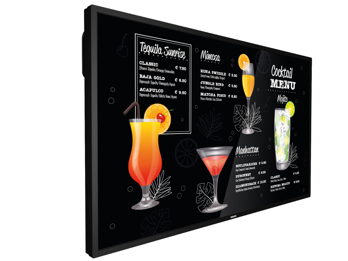 Čistý obraz v rozlišení UHD a vysoký jas dělají z tohoto displeje perfektní zařízení do náročného prostředí, jako jsou obchody, dopravní prostředky a prostory občerstvovacích služeb.