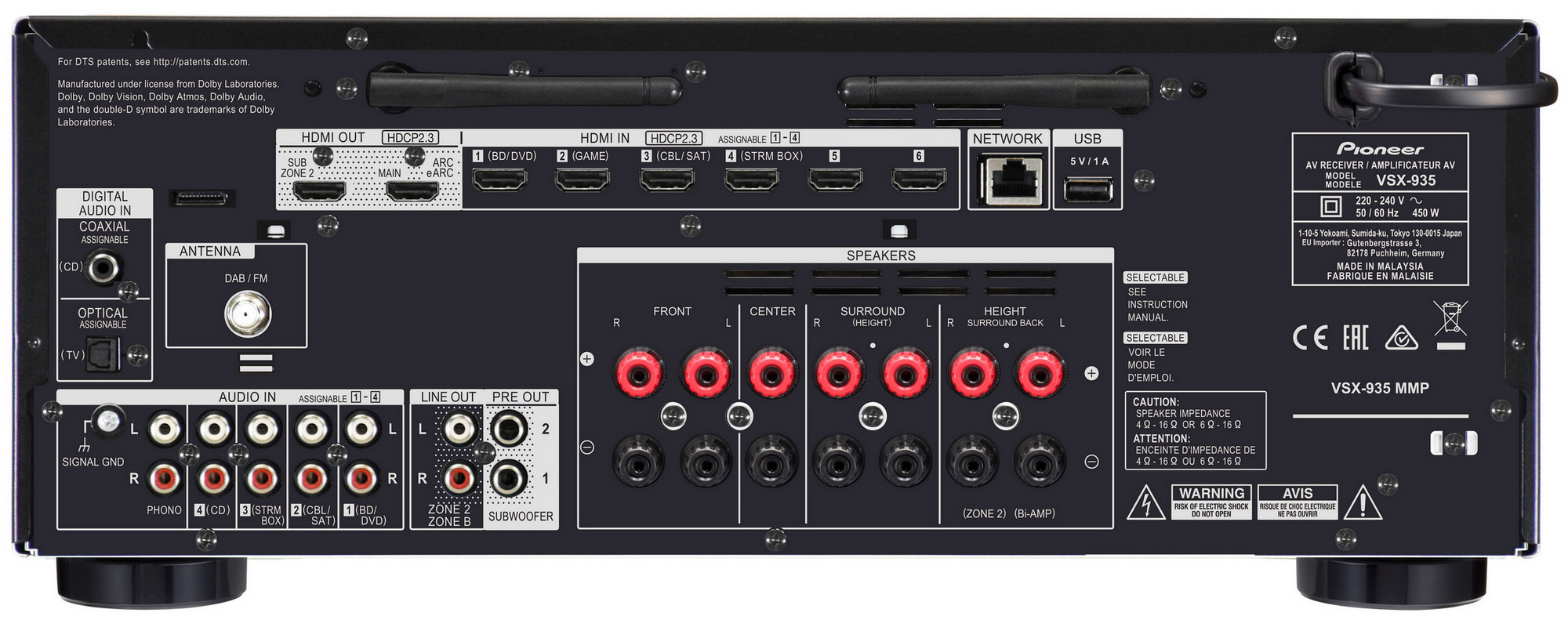 • 9kanálový výstup reproduktoru (FRONT, CENTER, SURROUND/HEIGHT, HEIGHT/SURROUND BACK/Bi-AMP, ZONE 2)
