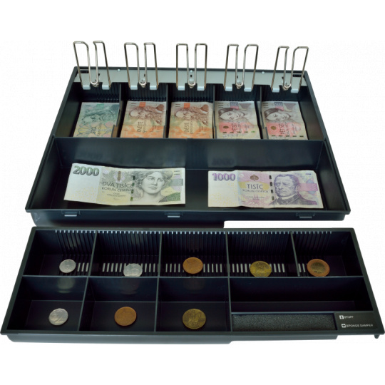 Dostatečně široký pořadač pro pohodlné umístění 5 druhů bankovek vedle sebe. Obsahuje vyjímatelný mincovník a pořadač bankovek s libovolně nastavitelnými přihrádkami. Pořadač disponuje kovovými držáky bankovek a je možné jej doplnit o uzamykatelný kryt EPP12050.