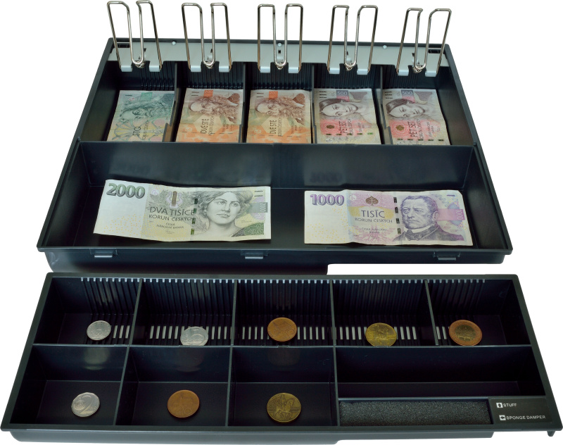 Dostatečně široký pořadač pro pohodlné umístění 5 druhů bankovek vedle sebe. Obsahuje vyjímatelný mincovník a pořadač bankovek s libovolně nastavitelnými přihrádkami. Pořadač disponuje kovovými držáky bankovek a je možné jej doplnit o uzamykatelný kryt EPP12050.