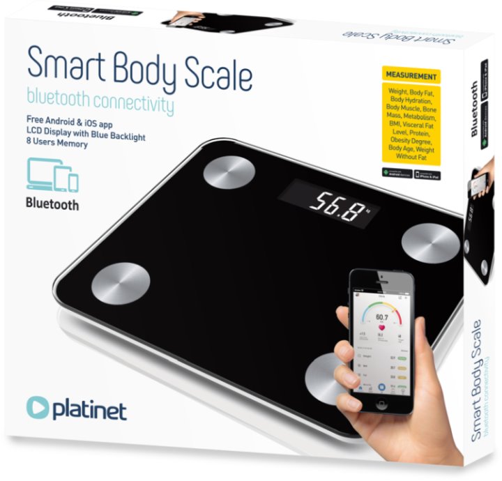Osobní váha PLATINET PBSBT vám umožňuje provádět měření hmotnosti a analýzu složení těla - tělesný tuk, tělesnou vodu, svaly, kostní hmotu, metabolismus, BMI, viscerální tuk, bílkoviny, stupeň obezity, tělesný věk a hmotnost bez tuku. Všechny tyto parametry lze vyčíst z jednoho provedeného měření.