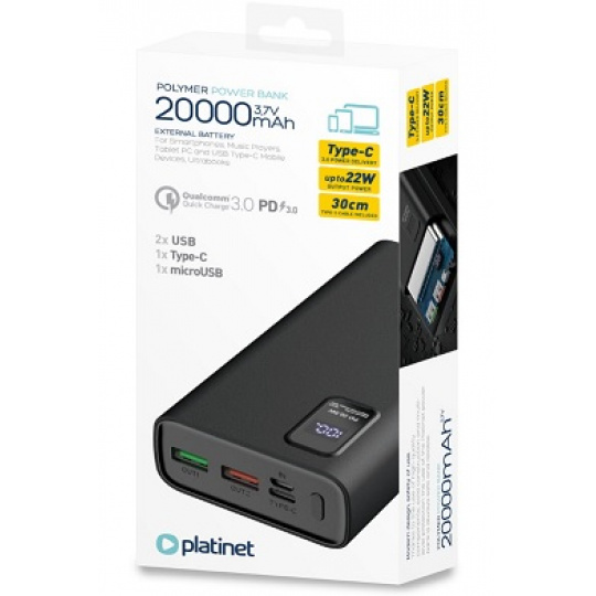 PLATINET POWER BANK 30000mAh Polymer PD 3.0 QC 3.0 LED Screen Black