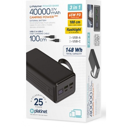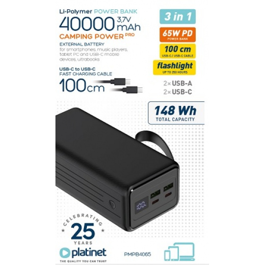 "PMPB4065 je vysokokapacitní nabíjecí power banka, která nabízí rychlé a efektivní napájení elektronických zařízení. S působivou kapacitou 40 000 mAh při 3,7 V (ekvivalent 29 600 mAh při 5 V) můžete své smartphony, tablety a další mobilní zařízení dobít několikanásobně, než budete muset powerbanku znovu připravit k použití.