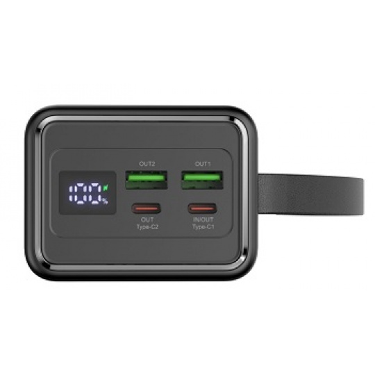 Je vybaven několika výstupními porty, včetně dvou standardních portů USB-A a dvou portů Type-C, z nichž jeden slouží k nabíjení samotné powerbanky. Porty USB nabízejí výstup 5V/4,5A, 5V/3A, 9V/2A a 12V/1,5A, zatímco port typu C nabízí výstup 5V/3A, 9V/3A, 12V/3A, 15V/3A, 20V/3,25A (PD65W), který umožňuje rychlé nabíjení různých zařízení.