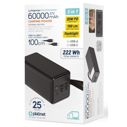 "PMPB4065 je vysokokapacitní power banka, která nabízí rychlé a efektivní napájení elektronických zařízení. S obrovskou kapacitou 60 000 mAh při 3,7 V (ekvivalent 44 400 mAh při 5 V) můžete své smartphony, tablety a další mobilní zařízení dobít několikanásobně, než budete muset powerbanku znovu připravit k použití.