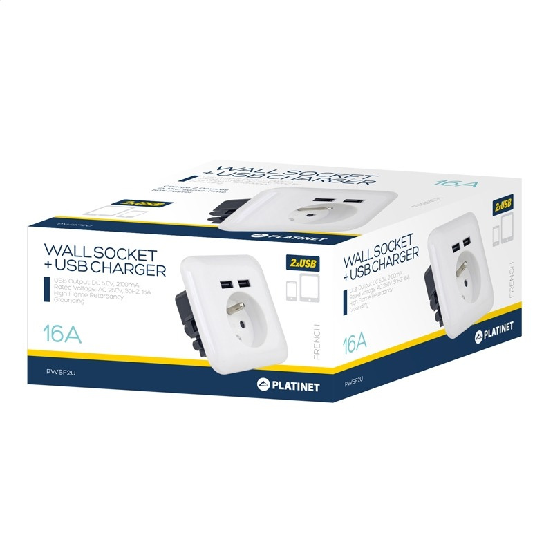 Nástěnná zásuvka (Ref PWSF2U) "francouzského typu" vybavená dvěma USB porty pro připojení dvou dalších zařízení. Jedná se o jednoduchý, ale velmi užitečný produkt, který vám umožní nabíjet všechny typy telefonů, tabletů a dalších dobíjecích zařízení přes USB port. Je tedy možné současně nabíjet 2 USB zařízení.