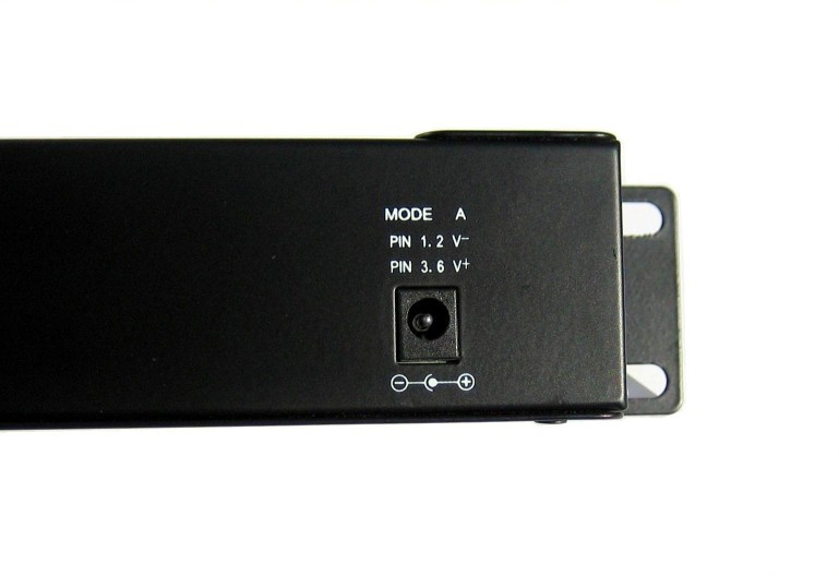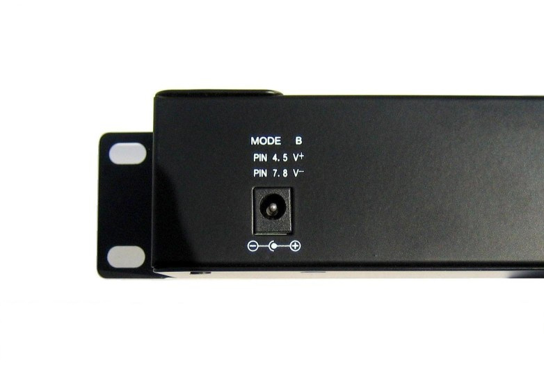 Vstup pro napájení prostřednictvím dvou 2.1mm 60V jacků, z obou vstupů je vždy zároveň napájeno všech 12 portů v režimu dle zvoleného A/B vstupu: