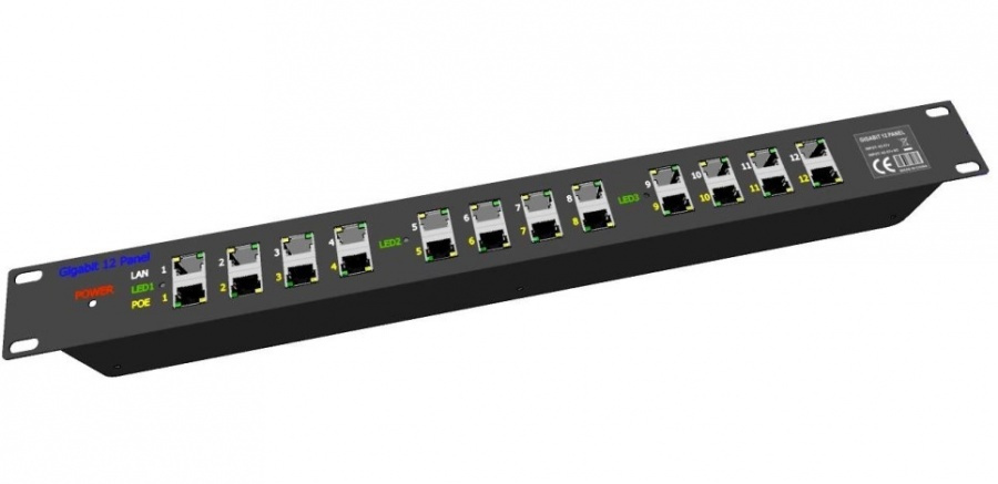 Panel do 19" racku integrující 12 gigabitových stíněných pasivních POE injektorů s napájecím rozsahem 24 - 57V.