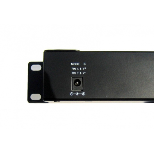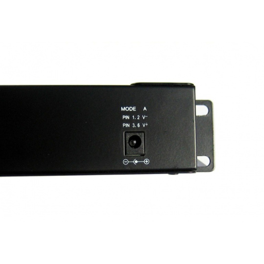 Vstup pro napájení prostřednictvím jednoho ze dvou 2.1mm 60V jacků, z obou vstupů je vždy zároveň napájeno všech 16 portů v POE režimu dle zvoleného A/B vstupu: