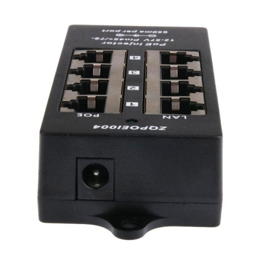 Do RJ45 konektorů na jedné straně se připojují ethernetové porty bez napájení (např. switch), na opačnou stranu se připojují zařízení využívají napájení po ethernetovém kabelu.