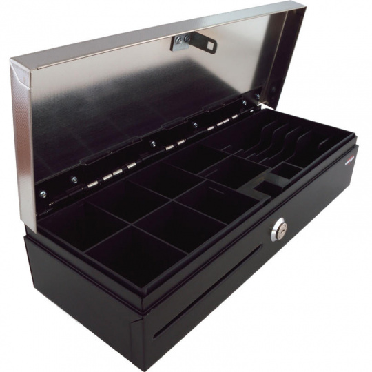 Pokladní zásuvka flip-top FT-460V2 - bez kabelu, se zam. krytem, NEREZ víko, černá