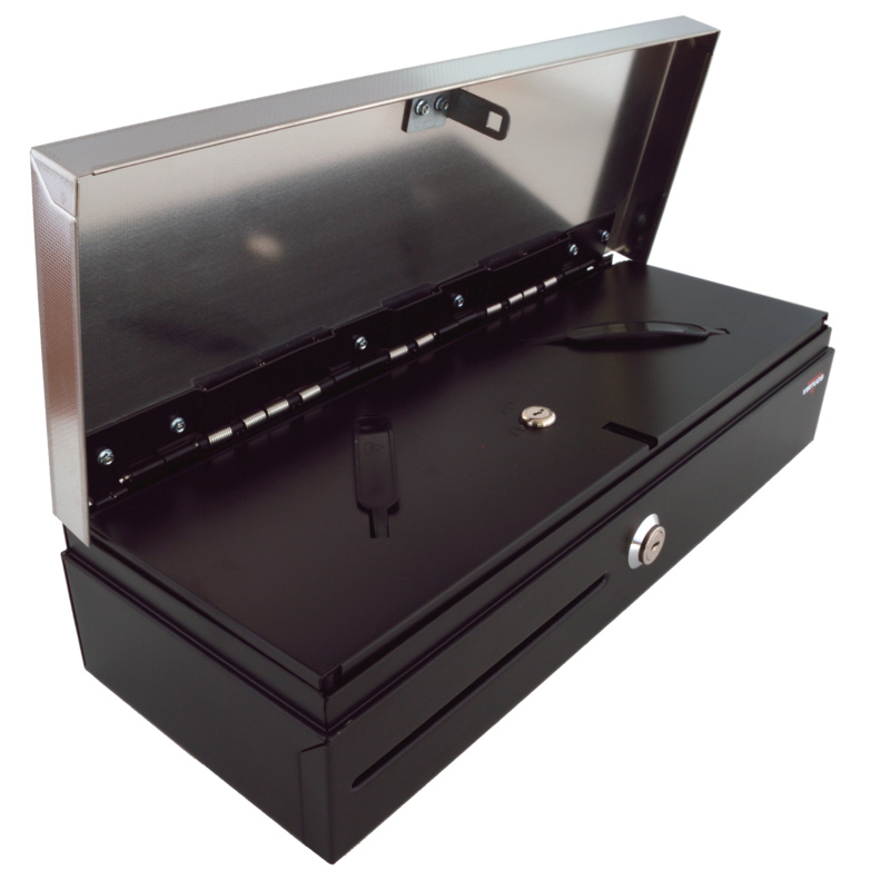 Pokladní zásuvka flip-top FT-460V2 - bez kabelu, se zam. krytem, NEREZ víko, černá