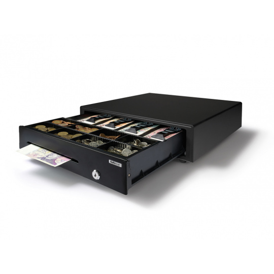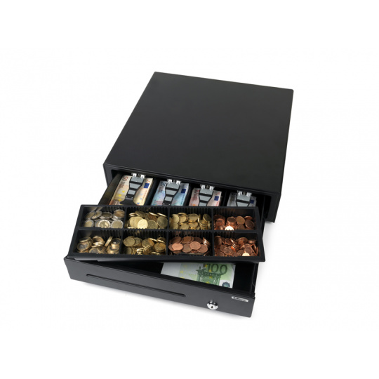 Pokladní zásuvka pro nenáročné použití Obsahuje oddělený prostor pro ukládání velkých částek a cenných papírů, aby nebyly na očích Silný kovový plášť Testováno minimálně na 500.000 otevření Elektrické otevírání a otevírání na klíč Vyjímatelný mincovník 4 úložná místa na bankovky / 8 na mince Obzvláště silný, 3polohový zámek (zamčeno, pohotovostní režim a odemčeno) Kompatibilní s pokladními tiskárnami a registračními pokladnami RJ12 (12 V / 24 V) Hmotnost: 5,5 kg Napájení: 12V/24V Rozměry: 41 cm (š) x 41,5 cm (h) x 11,5 cm (v) Barva: černá V balení také 2 ks klíčů