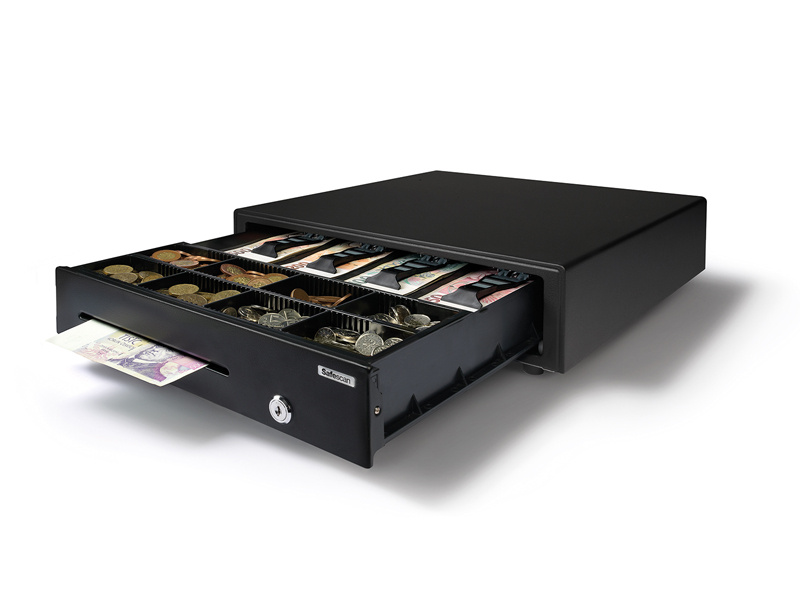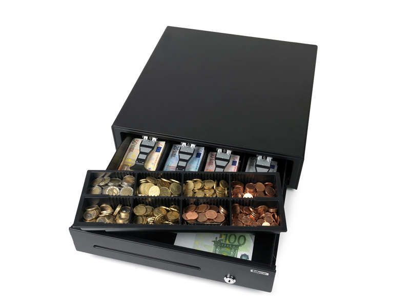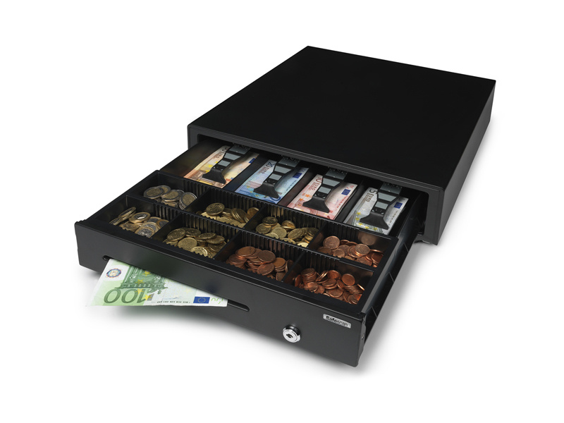 Pokladní zásuvka pro nenáročné použití Obsahuje oddělený prostor pro ukládání velkých částek a cenných papírů, aby nebyly na očích Silný kovový plášť Testováno minimálně na 500.000 otevření Elektrické otevírání a otevírání na klíč Vyjímatelný mincovník 4 úložná místa na bankovky / 8 na mince Obzvláště silný, 3polohový zámek (zamčeno, pohotovostní režim a odemčeno) Kompatibilní s pokladními tiskárnami a registračními pokladnami RJ12 (12 V / 24 V) Hmotnost: 5,5 kg Napájení: 12V/24V Rozměry: 41 cm (š) x 41,5 cm (h) x 11,5 cm (v) Barva: černá V balení také 2 ks klíčů