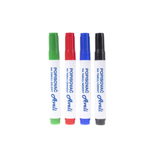 Popisovač pro tabule a flipcharty AVELI. Sada barevných popisovačů - černý, zelený, modrý a červený