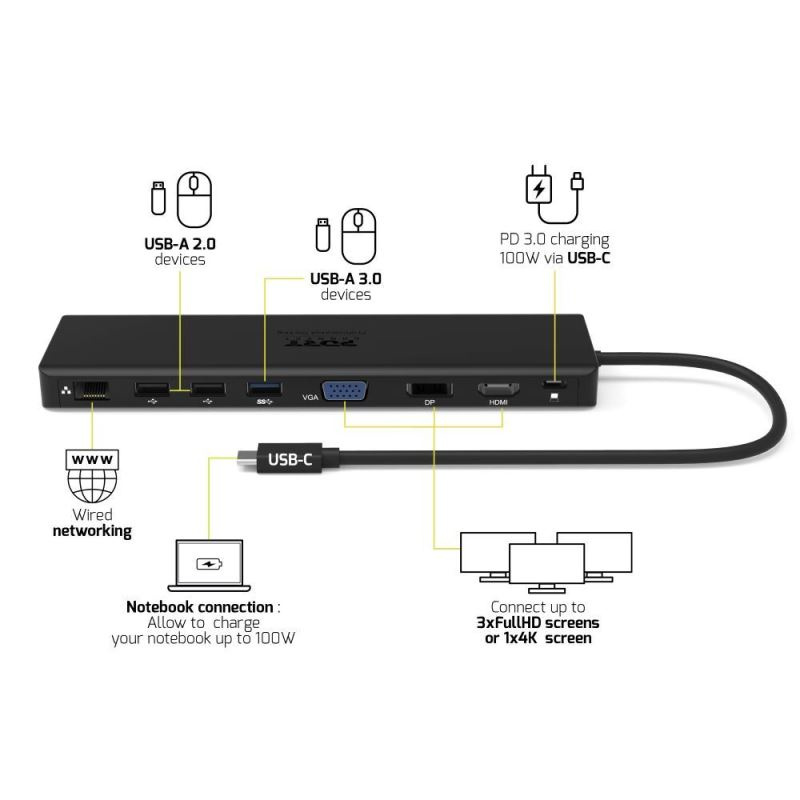 PORT CONNECT Dokovací stanice 11v1, 1x4K, RJ45,HDMI,Display Port,VGA,USB-C 100W, 4xUSB-A,micro/SD