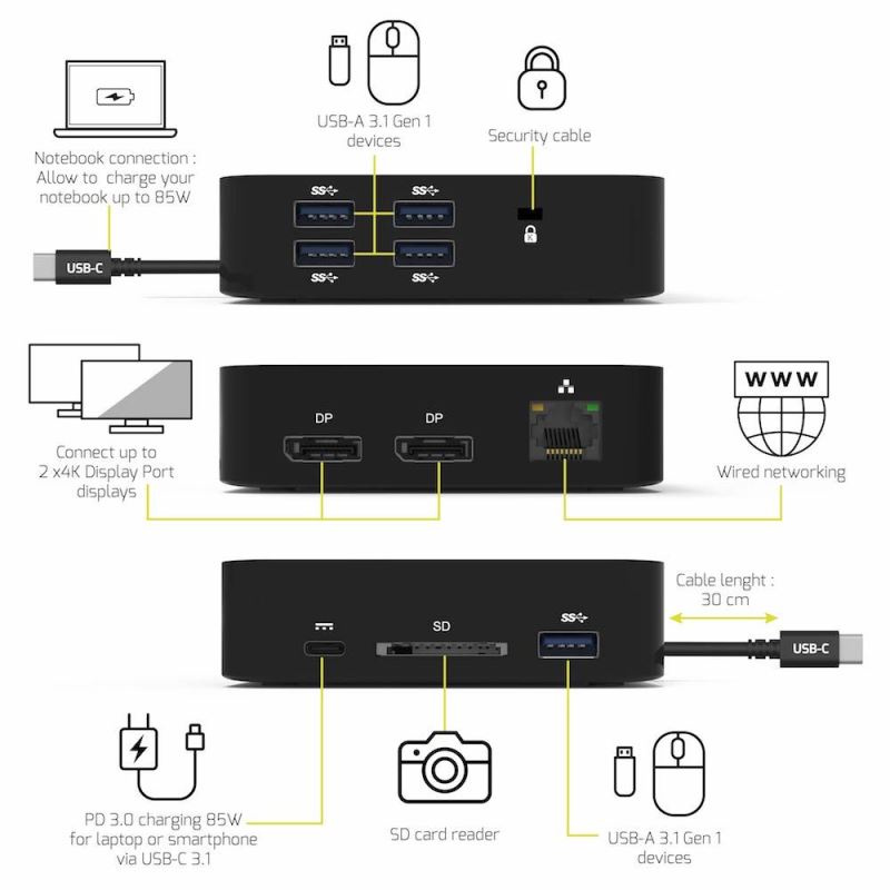 Dobíjejte s výkonem až 85W a přitom připojte 10 periferií přes jeden port USB-C. 2x4K Display Port, 5x USB-A, USB-C 85W PD, Ethernet, SDkarta.
