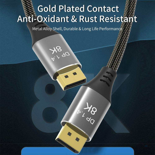 PremiumCord DisplayPort 1.4 přípojný kabel 32,4 Gbit/s, rozlišení 8K, kovové a zlacené konektory, 1 m Kabel je vybaven standardem DisplayPort 1.4 a poskytuje obzvláště vysokou šířku pásma, ideální pro plynulé přehrávání obrazu bez trhání obrazovky nebo trhání při hraní her a rozlišení ostré jako břitva s rozlišením až 8K nebo 4k. Špičková konstrukce kabelu jej předurčuje pro všechny druhy instalací. Jedná se o flexibilní prémiový kabel s tenkými kovovými konektory, ochranou proti ohybu a barevně sladěným textilním kabelem (opletený textilní plášť kabelu monitoru je příjemný na dotek a šetrný k citlivým povrchům). DisplayPort 1.4 zvyšuje maximální datovou rychlost o 50% oproti rychlostem datového přenosu DisplayPort 1.2 na 32,4Gbit/s. Technické parametry Maximální rozlišení: - 8K (7680x4320) při 60Hz a 24 bitová barevná hloubka - 5K (5120x2880) při 60Hz a 30 bitová barevná hloubka - 4K (3840×2160) při 144Hz a 60Hz a 24 bitová barevná hloubka - 2K (2560 × 1440) při 240Hz a 165Hz - FULL HD 1080p (1920x1080) při 240Hz - podporuje HDCP 2.2 a HDCP1.4, podporuje 3D a EDID - podporuje FreeSync a G-Sync, Dynamic HDR a také 32 audio kanálů a mnoho oblíbených audio formátů, např. DTS-HD Master Audio * Verze DisplayPort 1.4 * Maximální datový přenos: 32,4 Gb/s * Podporovaná barevná hloubka: (30 Bit), True Color (24 Bit) * Konektory: DisplayPort (20pinů) male <=> DisplayPort (20pinů) male * 20-vodičový kabel, dvojité stínění, 100% měděný vodič průřezu AWG30 * Pozlacené kontaktní plochy zajišťují optimální přenos signálu a zabraňují korozi * Kovové hliníkové krytky konektorů * Tloušťka kabelu: 6 mm * Kabel s měkkým bavlněným opletem: barva černo-šedá * Barva konektorů: Space Grey * Balení v PVC sáčku s EAN kódem a popisem * Délka kabelu: 1 m