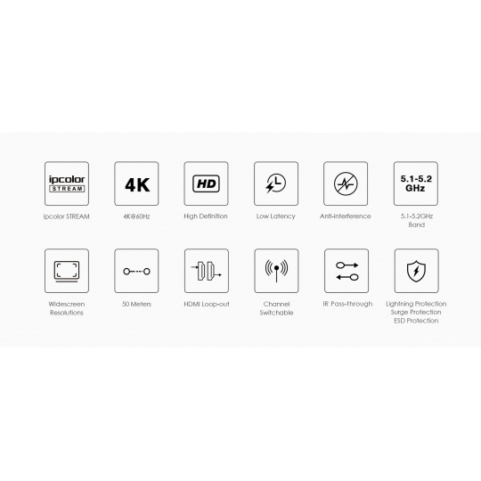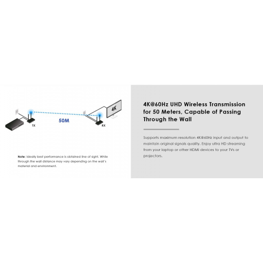 - Poporuje bezdrátový přenos rozlišení 4K@60Hz a Full HD 1080p na vzdálenost až 50m