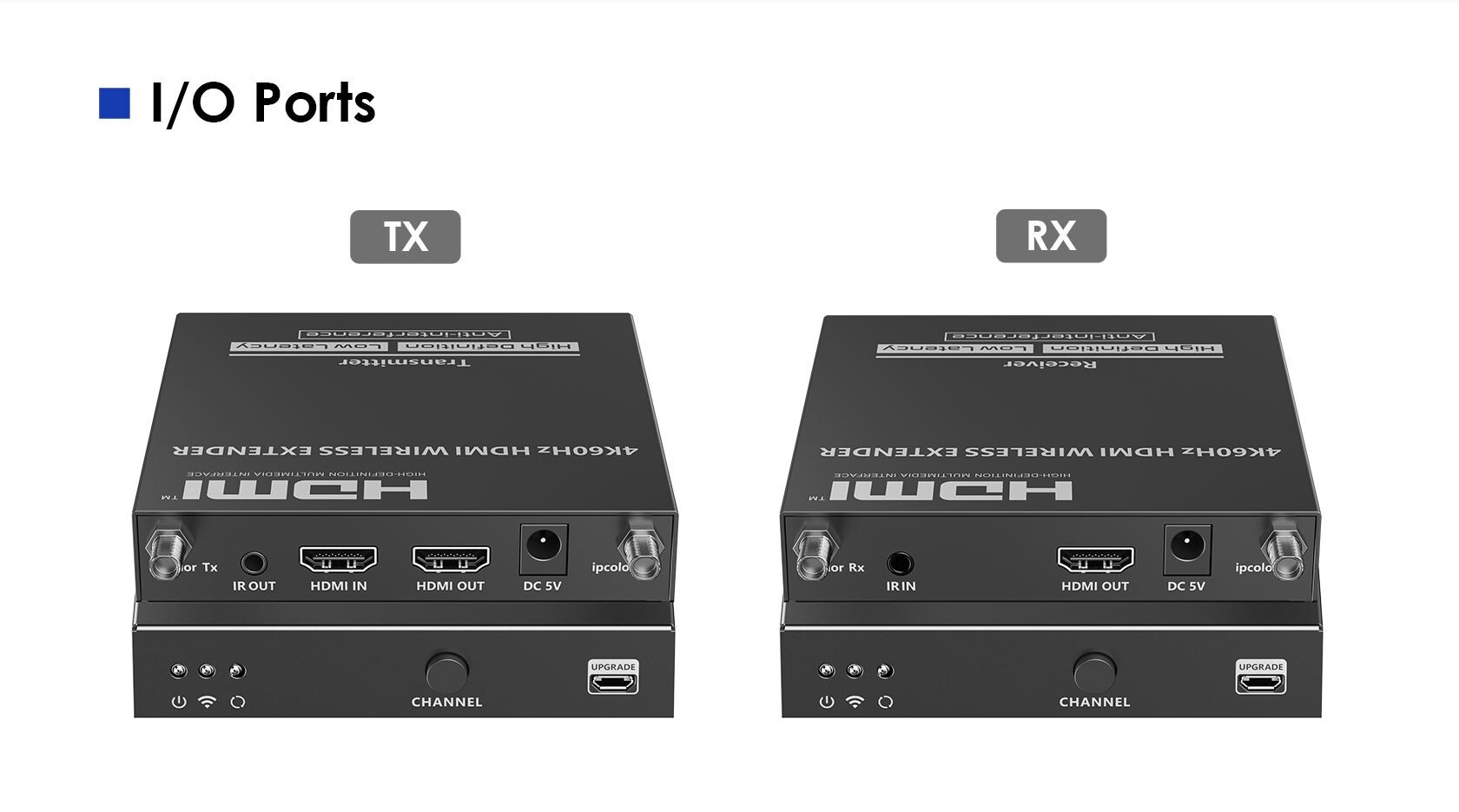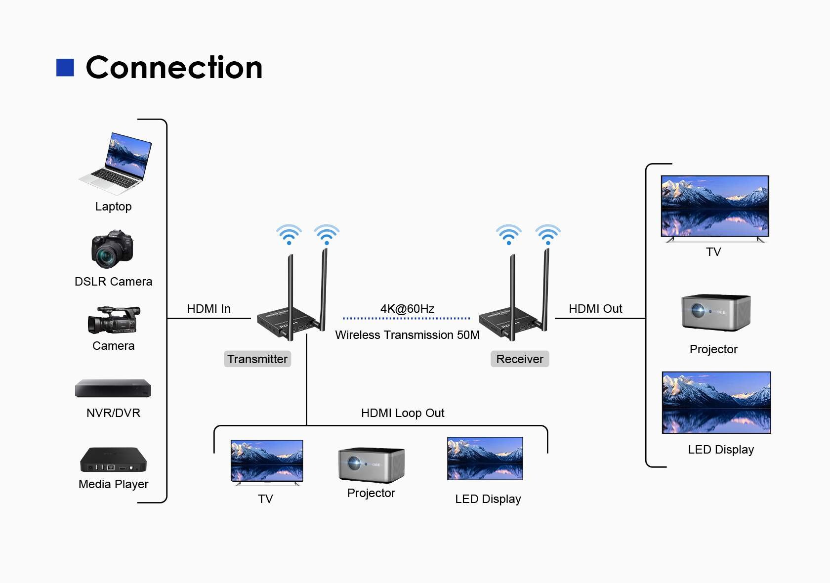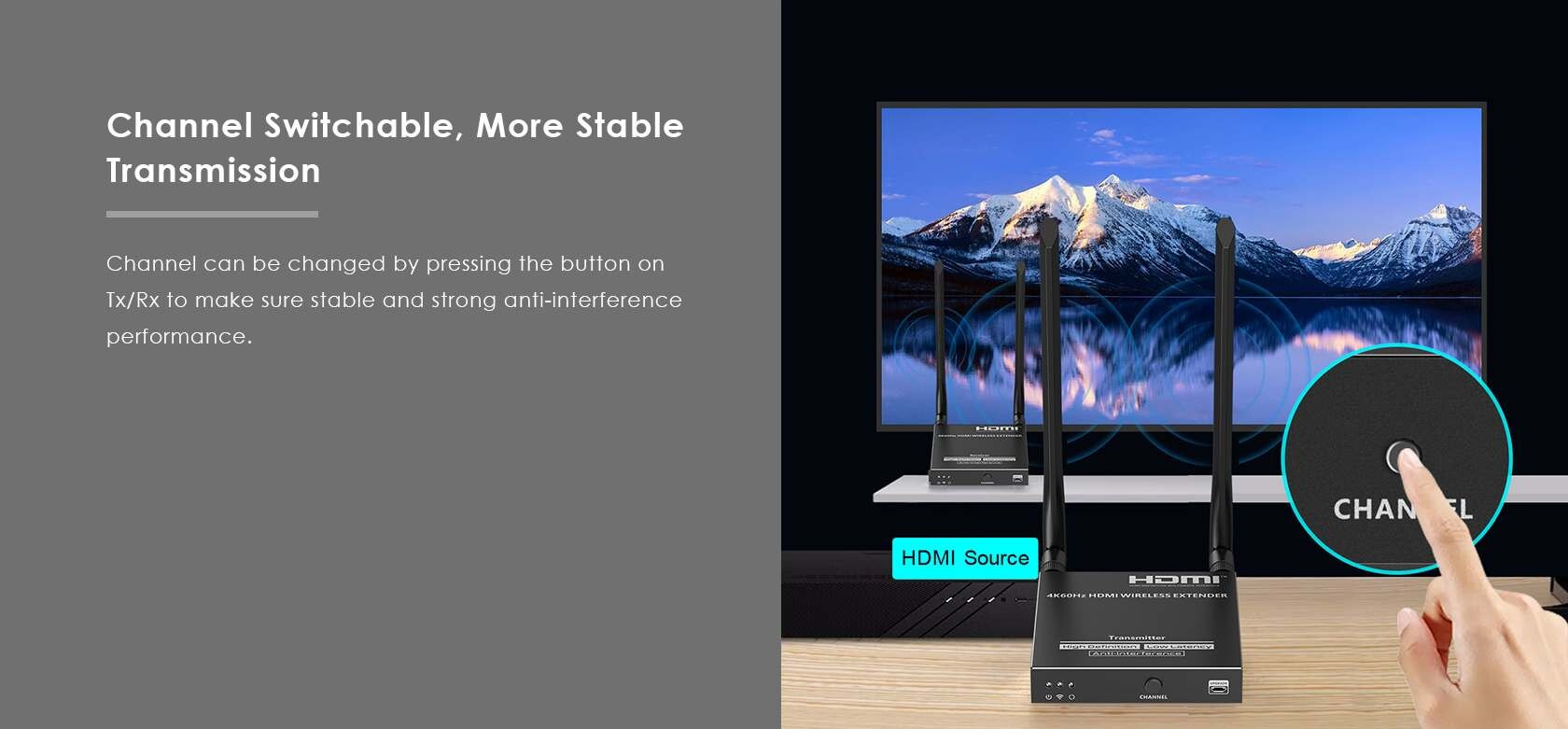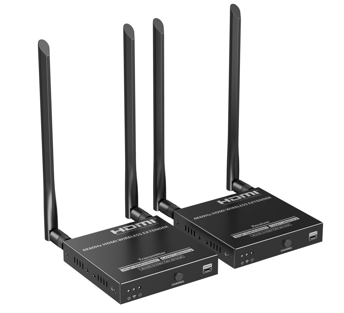 - Bezdrátový vysílač a přijímač signálu HDMI2.0 umožňuje propojit počítač s monitorem na vzdálenost až 50m