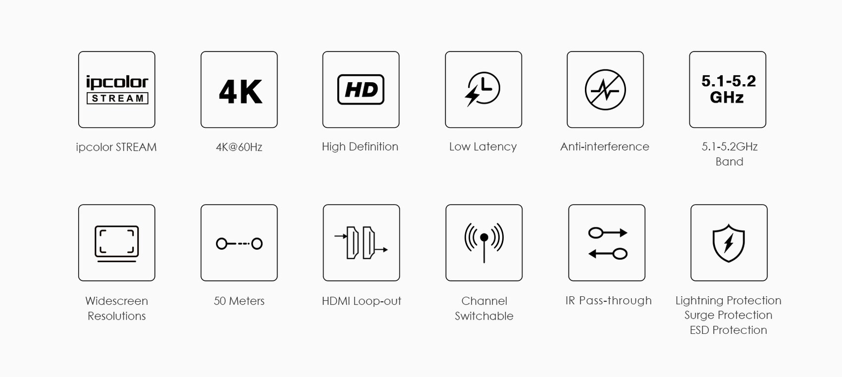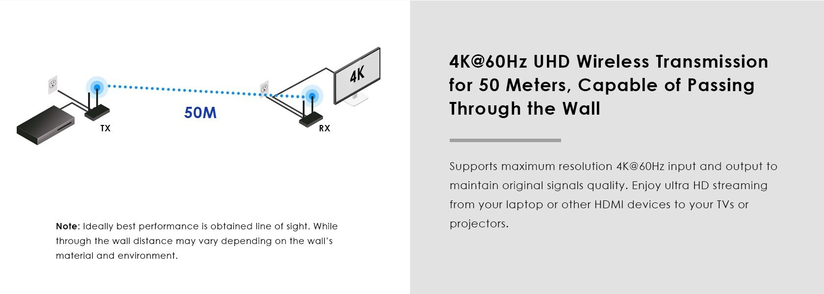 - Poporuje bezdrátový přenos rozlišení 4K@60Hz a Full HD 1080p na vzdálenost až 50m