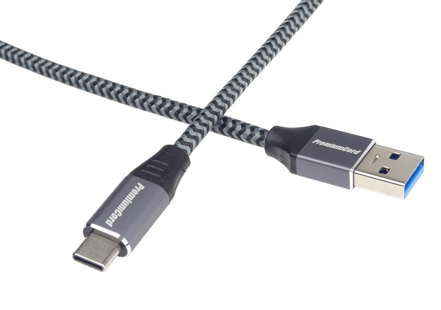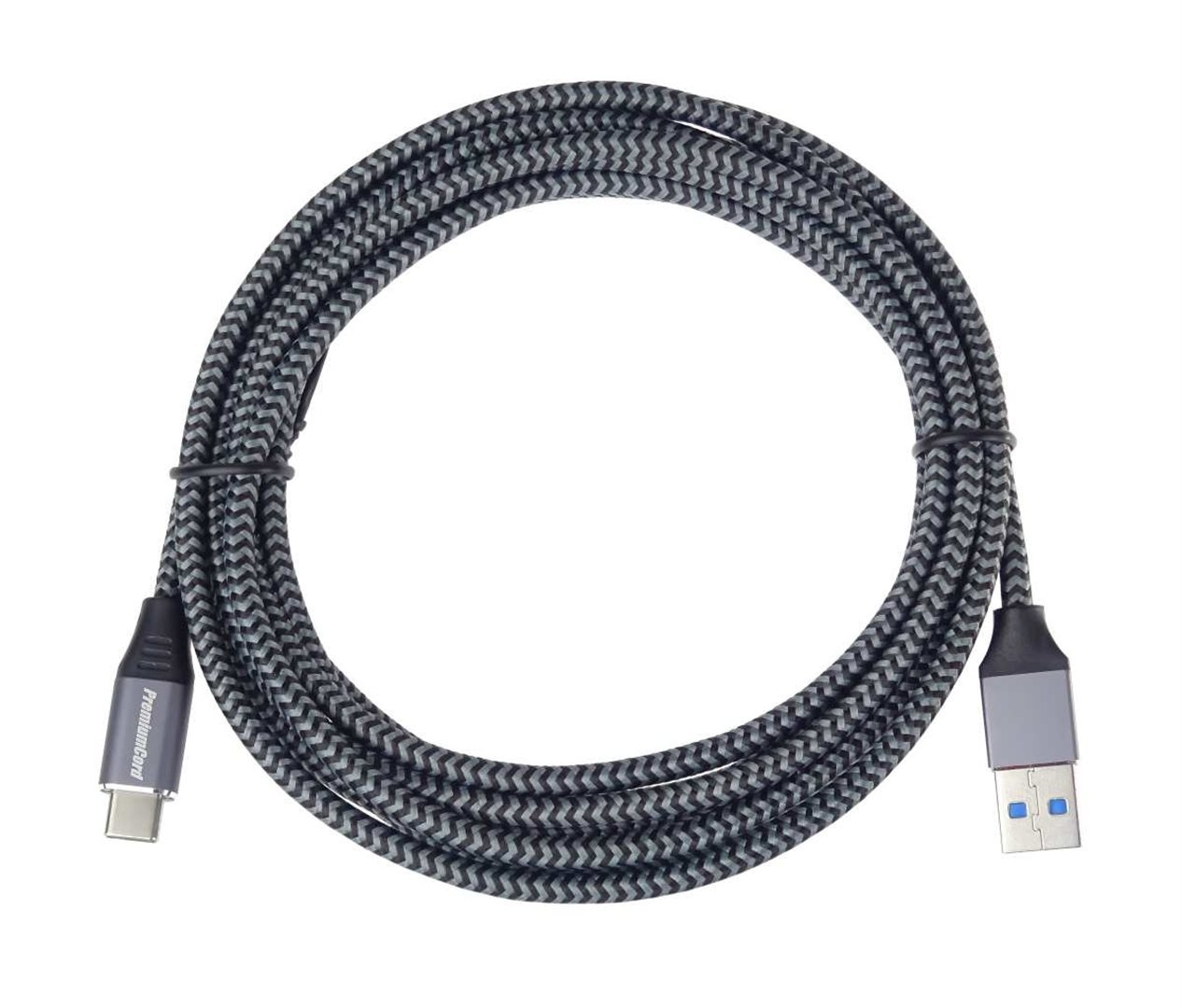 PremiumCord kabel USB-C - USB 3.0 A (USB 3.1 generation 1, 3A, 5Gbit/s) 3m bavlněný oplet a kovové hliníkové konektory
