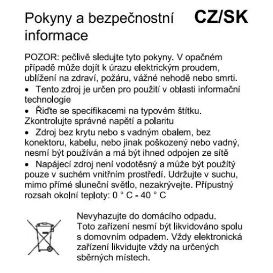 - 100-240V / 50Hz AC vstupní napětí, síťová vidlice