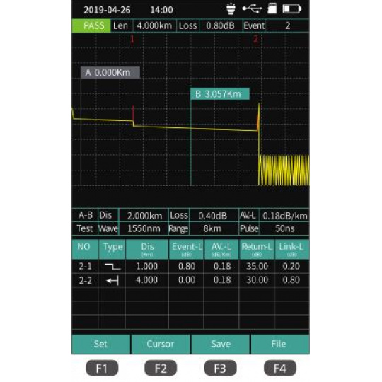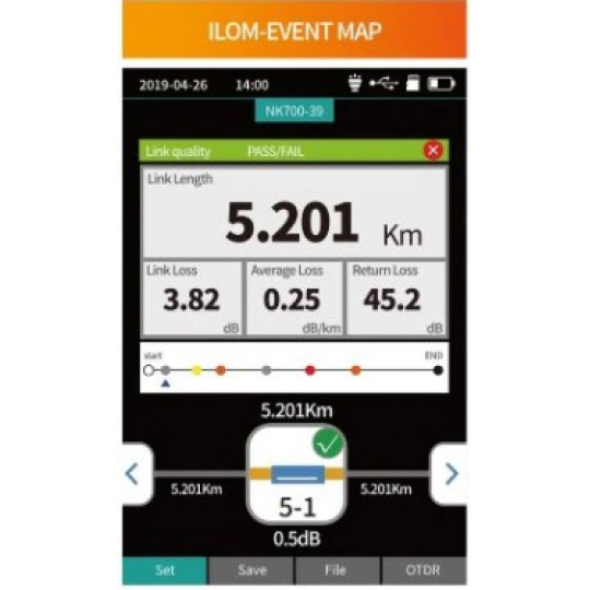 Možnost uložit a vytisknout výsledky měření v grafu nebo Event Map. Přenášení dat mezi OTDR a PC přes MicroUSB.