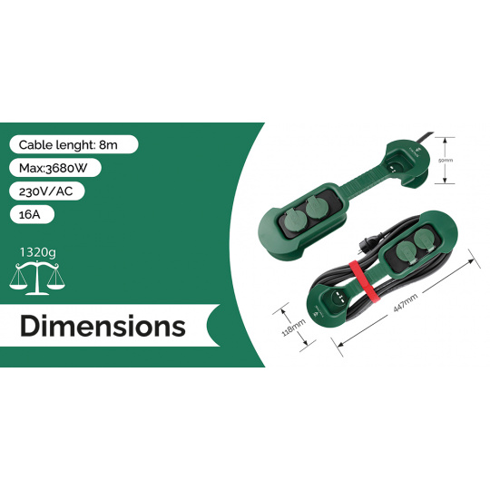 Prodlužovací kabel - délka 8 m • robustní konstrukce • 2 x zásuvka AC (230V) výstup • vstup AC 230V, 16A, 50Hz • ochrana IP44 proti stříkající vodě a prachu • max. výkon 3680W • rozměry 44,7 x 11,8 x 5 cm • hmotnost 1320g
