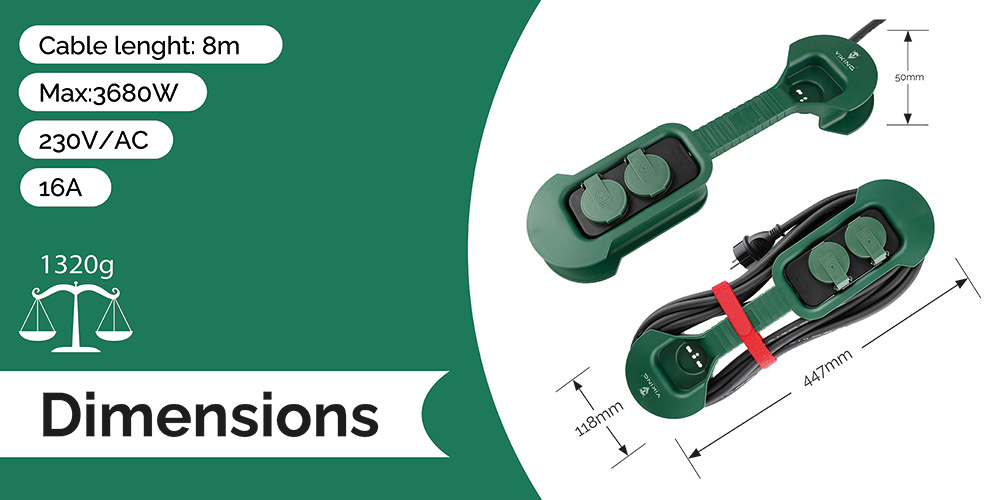 Prodlužovací kabel - délka 8 m • robustní konstrukce • 2 x zásuvka AC (230V) výstup • vstup AC 230V, 16A, 50Hz • ochrana IP44 proti stříkající vodě a prachu • max. výkon 3680W • rozměry 44,7 x 11,8 x 5 cm • hmotnost 1320g