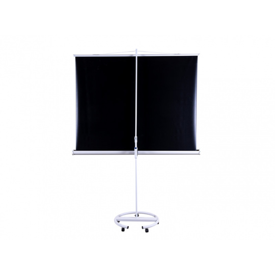 Mobilní stativové projekční plátno AVELI má stabilní základ s pěti kolečky. Plátno je matně bílé s černým orámováním s formátem 4:3.