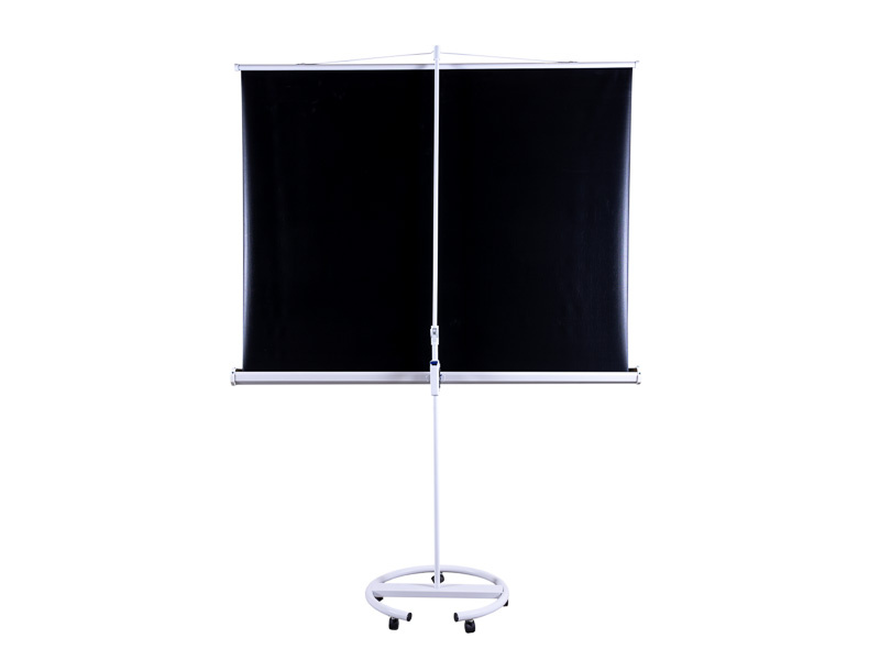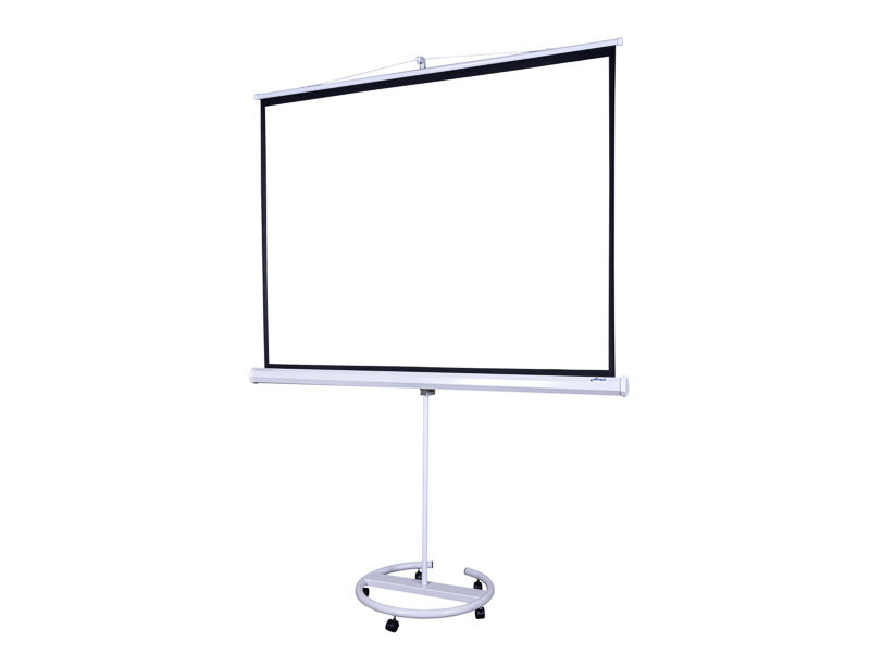 Mobilní stativové projekční plátno AVELI má stabilní základ s pěti kolečky. Plátno je matně bílé s černým orámováním s formátem 4:3.