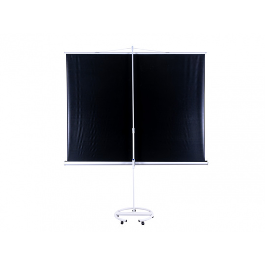 Mobilní stativové projekční plátno AVELI má stabilní základnu s pěti kolečky. Plátno je matně bílé s černým orámováním s formátem 4:3.