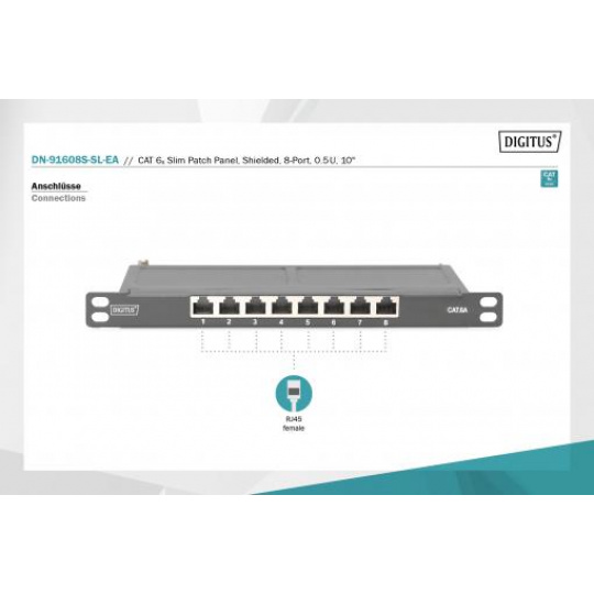 Propojovací panel DIGITUS CAT 6A, stíněný, 8portový, 0,5U, 10 ", černý