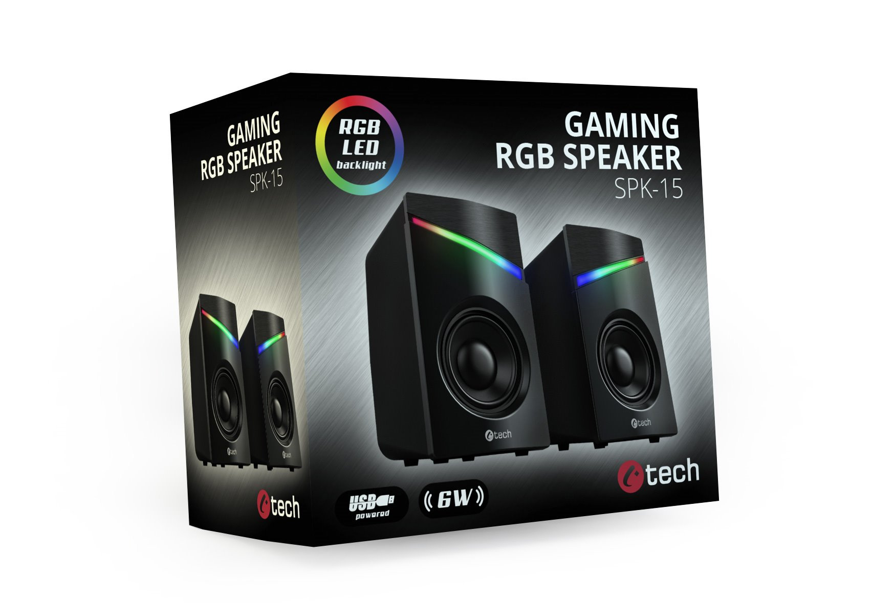 Kompaktní PC reproduktory C-tech SPK-15 2.0 vám zprostředkují kvalitní zvuk s výkonem 6W a frekvenčním rozsahem 150-20kHz. O jedinečnou atmosféru při poslechu hudby se postará automatické RGB podsvícení. K ovládání hlasitosti poslouží praktický ovladač, který je umístěn přímo na propojovacím kabelu. K tomuto ovládacímu prvku tak máte vždy bezproblémový přístup, takže můžete zvuk kdykoliv ztlumit či zesílit opravdu komfortně. Připojení soustavy k zařízením zajistí kabel s 3,5mm jackem, napájení zase USB kabel.