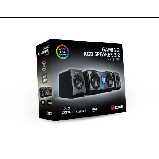 Kompaktní PC reproduktory C-tech SPK-16BK 2.2 vám zprostředkují kvalitní zvuk s výkonem 16W a frekvenčním rozsahem 150-20kHz. Díky unikátní kombinaci měničů 2+2 je reprodukovaný zvuk bohatší a více dynamický, takže si jej využijete nejen při poslechu oblíbených skladem, ale i při hraní her. O jedinečnou atmosféru při poslechu hudby se postará automatické RGB podsvícení. K ovládání hlasitosti poslouží regulátor nacházející se na jednom z reproduktorů. Tento regulátor slouží k zapnutí a vypnutí zařízení. Připojení soustavy k zařízením zajistí kabel s 3,5mm jackem, napájení zase USB kabel.