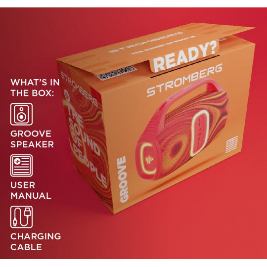 Reproduktor Stromberg GROOVE – stylový parťák na každou akci. Moderní design v červené barvě zaujme na první pohled. výkon 30 W a výdrž baterie až 12 hodin vám pak zajistí skvělý hudební zážitek bez přerušení. Díky funkci Stromberg Connect si navíc můžete vychutnat ještě silnější stereo efekt.