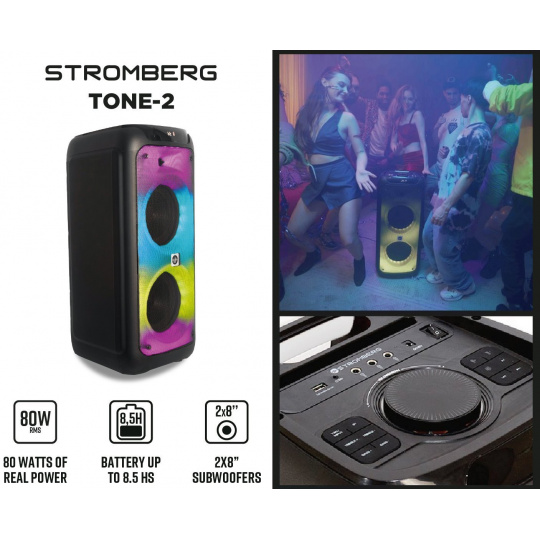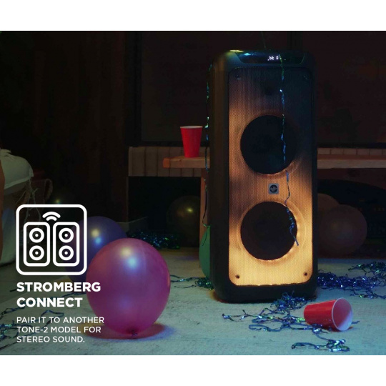 Stromberg TONE-2 – výkonný Bluetooth reproduktor, který rozzáří každou akci. S RGB LED podsvícením, výkonem 80 W a mikrofonem v balení je ideální volbou pro večírky, karaoke i domácí poslech. Technologie Stromberg Connect umožní propojení dvou jednotek a vytvoření stereo efektu. Díky výdrži až 8,5 hodiny si užijete hudbu bez přerušení, ať jste kdekoli.