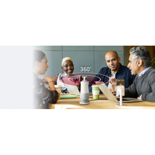 360stupňový panoramatický pohled 360stupňová vysokorozlišovací kamera zobrazuje všechny účastníky schůzky v panoramatickém pohledu, takže všichni jsou vidět stejně a nikdo nevypadá vzdáleně.