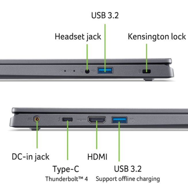 Aspire 15 (A15-61M-R9BR) - Windows 11 Home - AMD Ryzen™ 5 8640HS - NPU AMD Ryzen™ AI up to 16 TOPS - 8 GB DDR5 Memory On Board + 8 GB DDR5 Memory - 512GB PCIe NVMe SSD PM4 + N/A - 15,6" FHD 1920x1080 IPS Anti-Glare 300nits - AMD Radeon™ 760M - Wifi 6E 802.11ax 2x2 MU-MIMO + BT 5.3 - FHD USB TNR Camera with 2Mic. - Backlight KB - Finger Print on Touchpad - 2x USB Type-C port supporting: USB4 ® 40Gbps / Display port over USB-C / USB charging 5 V; 3 A / DC-in port 20 V; 65 W - 2x USB 3.2 Gen1 - HDMI 2.1 - Copilot Key (AI) - Acer Sense App - 53Wh Li-ion battery - 65W USB Type-C AC Adapter PCR50% TCO9.0 - Steel Gray + Steel Gray Aluminium LCD cover