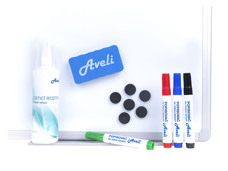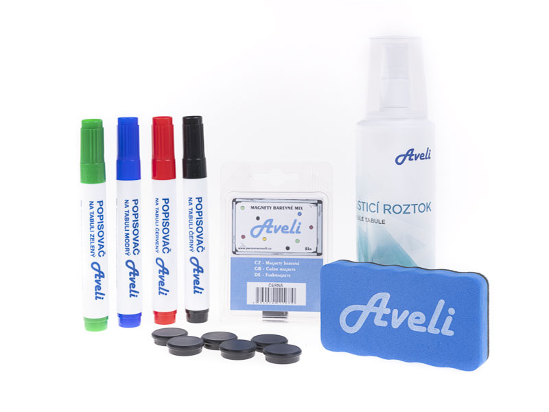 Základní sada pomůcek k popisovacím tabulím. Sada obsahuje: 4 barevné popisovače na bílé tabule, čistící 250 ml sprej, 6 černých kulatých magnetů o průměru 24mm, 1 magnetická stěrka