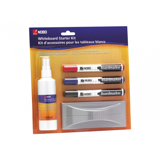 Sada základních pomůcek k popisovacím tabulím v blistru. Vhodné pro všechny typy bílých tabulí stíratelných za sucha.