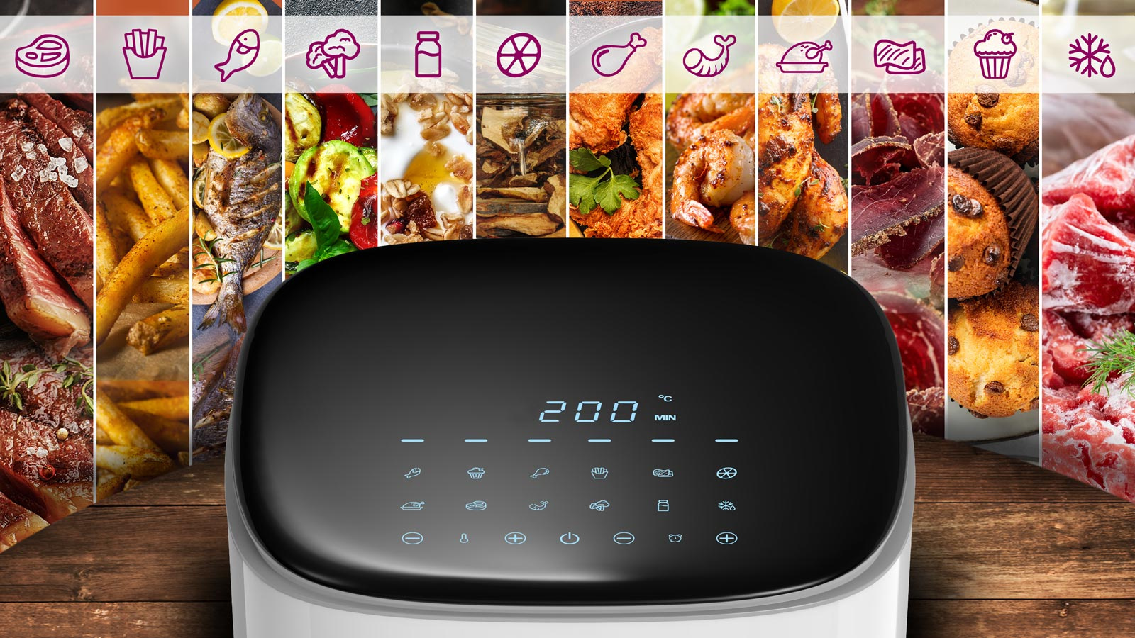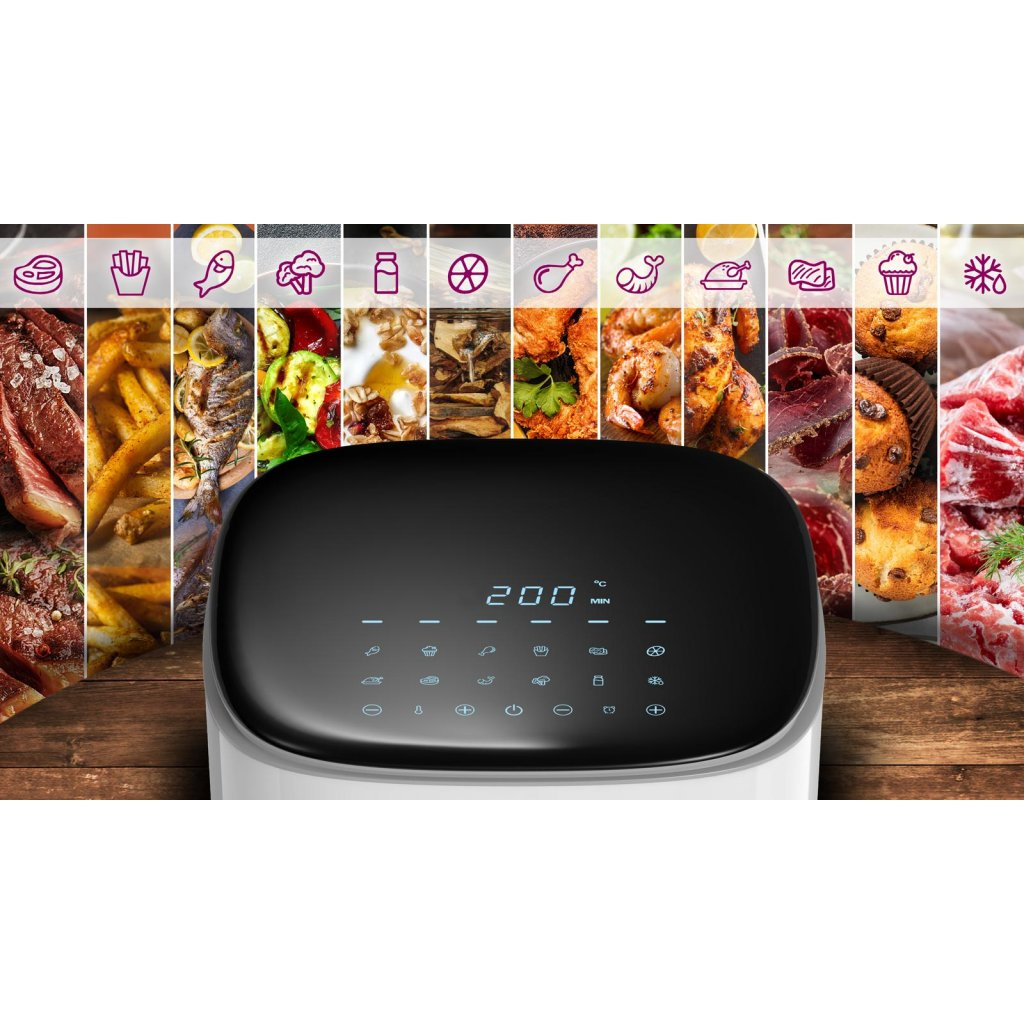 • 12 přednastavených programů: Ryby & Muffiny & Kuřecí stehna & Hranolky & Sušené maso & Sušené houby, ovoce a zelenina & Kuře & Steak & Krevety & Zelenina & Jogurt & Rozmrazování